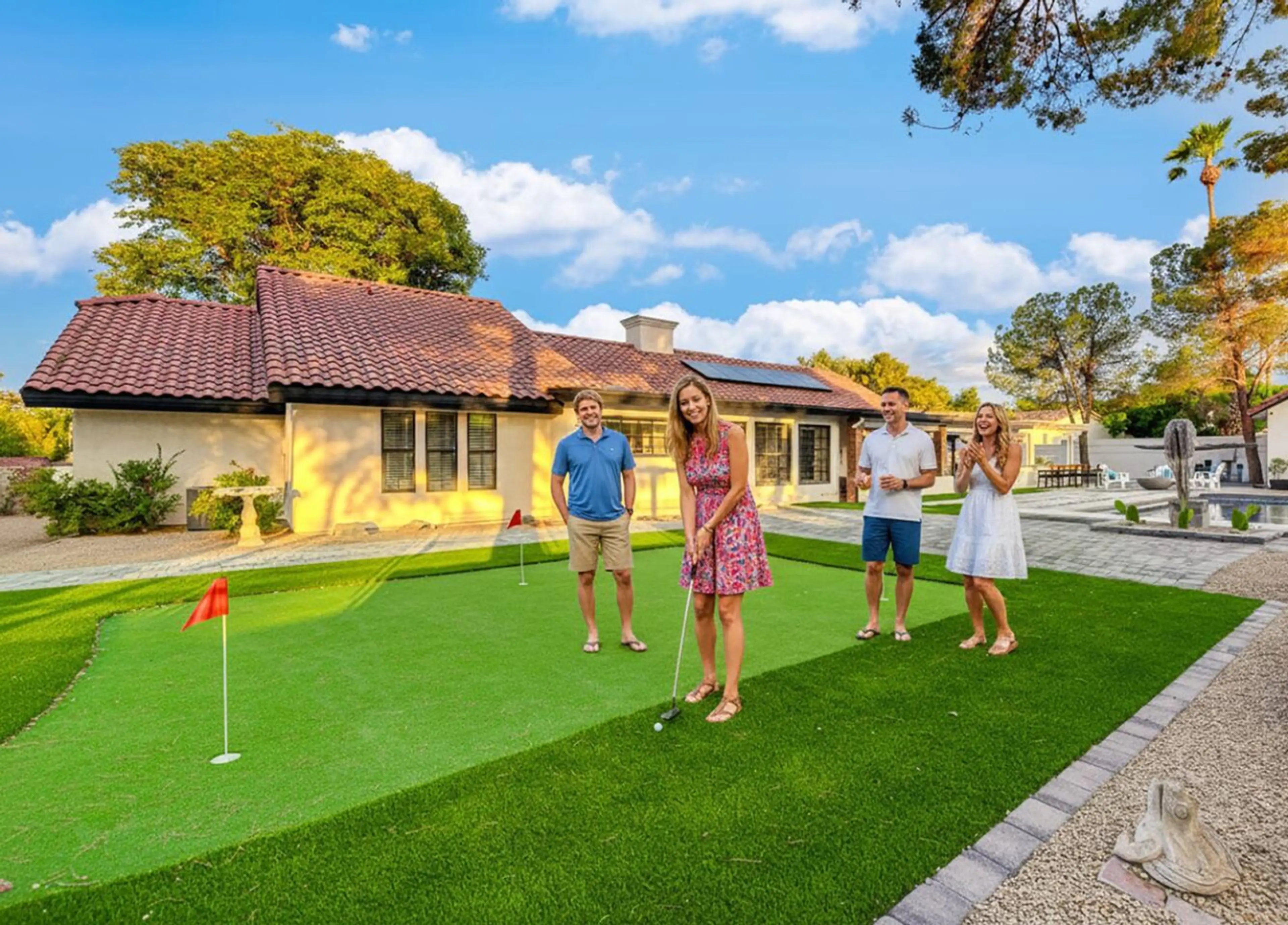 Families & Groups Love Our Home Single-story layout - Easy access for all ages and abilities Heated Pool - Make a splash together! (heating available for extra fee) Hot Tub - Laughs & relaxation under the stars Fire Pit - Roast marshmallows & share stories Putting Green - Family golf tournaments! P...